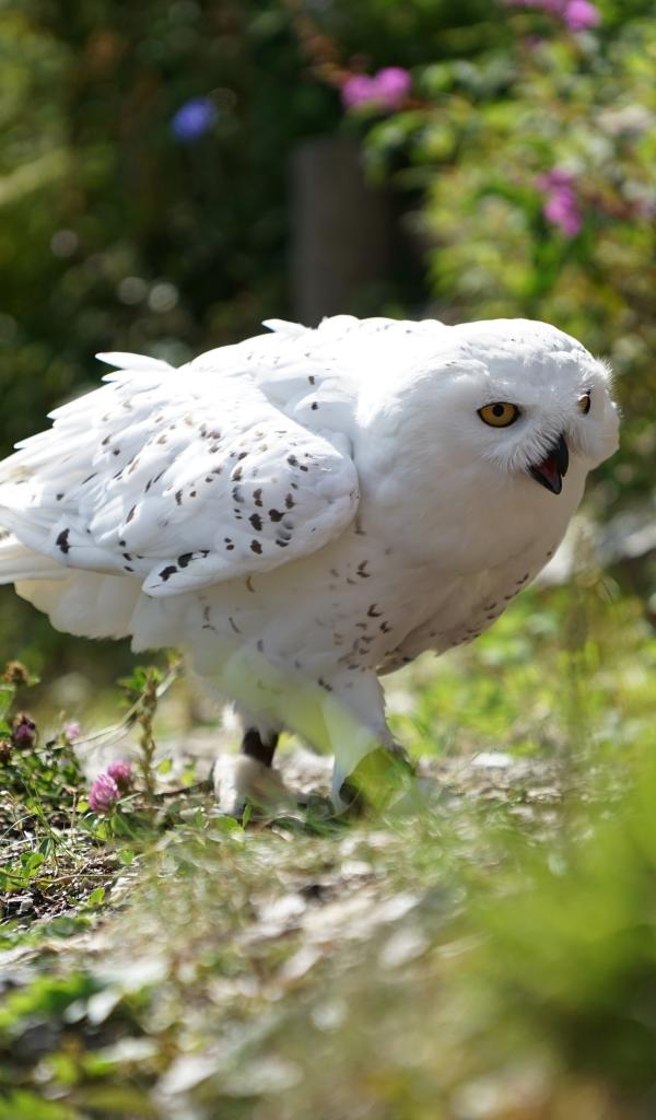 Обои Большая белая сова крадется в траве