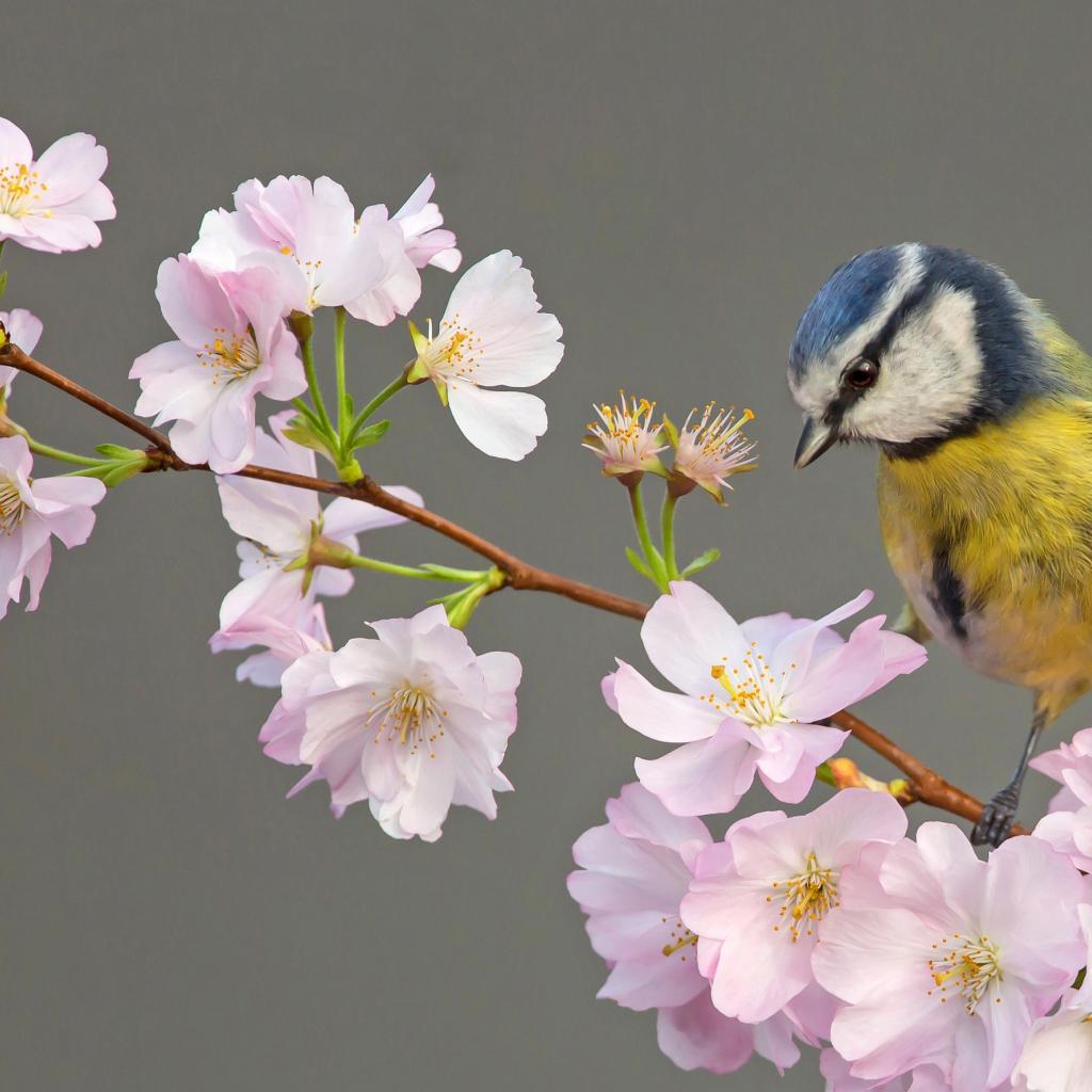 Обои Маленькая синица сидит на ветке с цветами