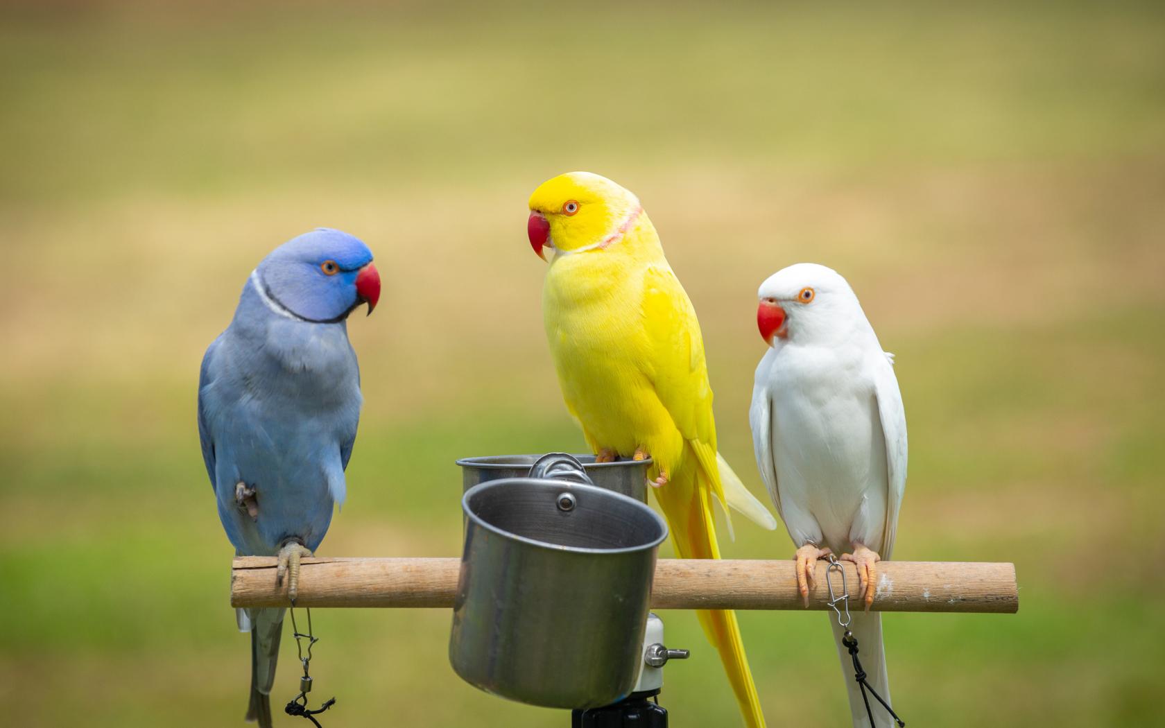 Обои Три разноцветных попугая сидят на жердочке с едой