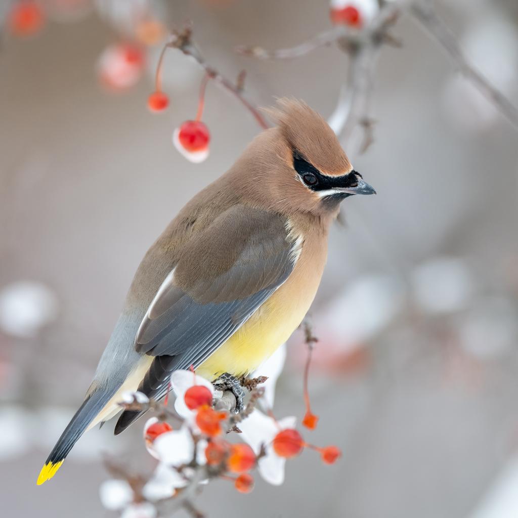 Обои Американский свиристель на ветке дерева зимой