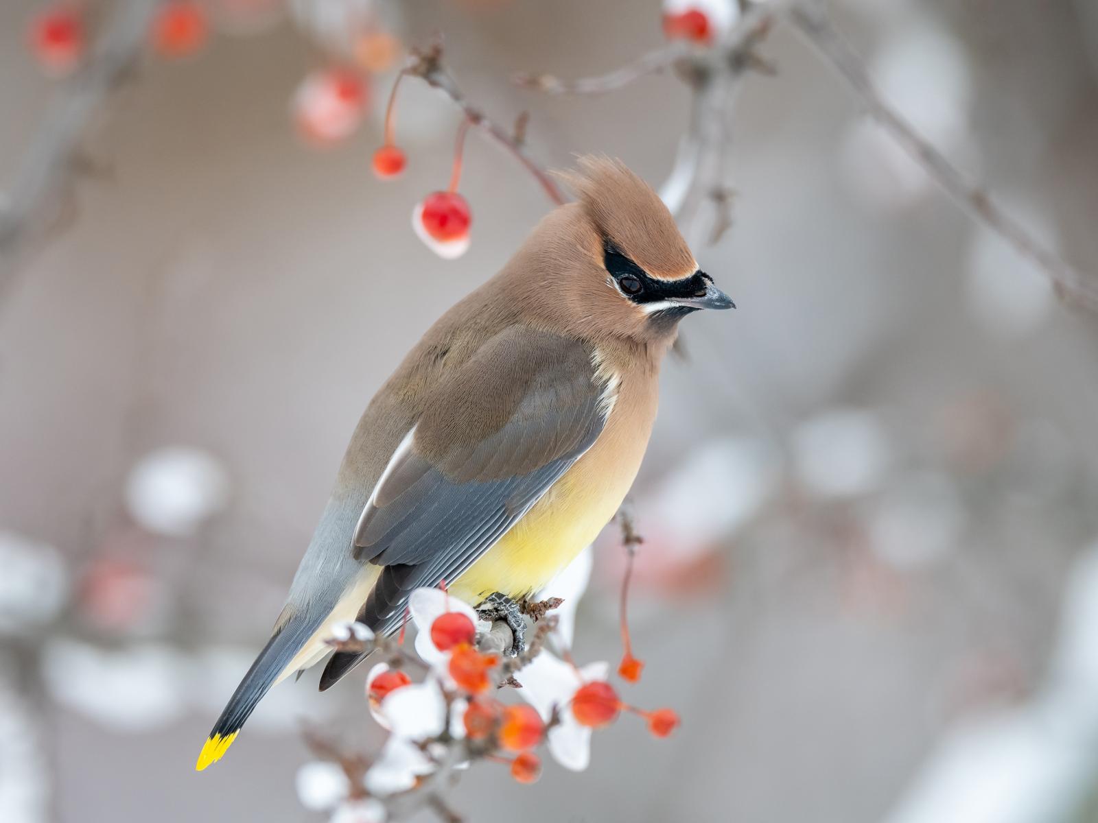 Обои Американский свиристель на ветке дерева зимой