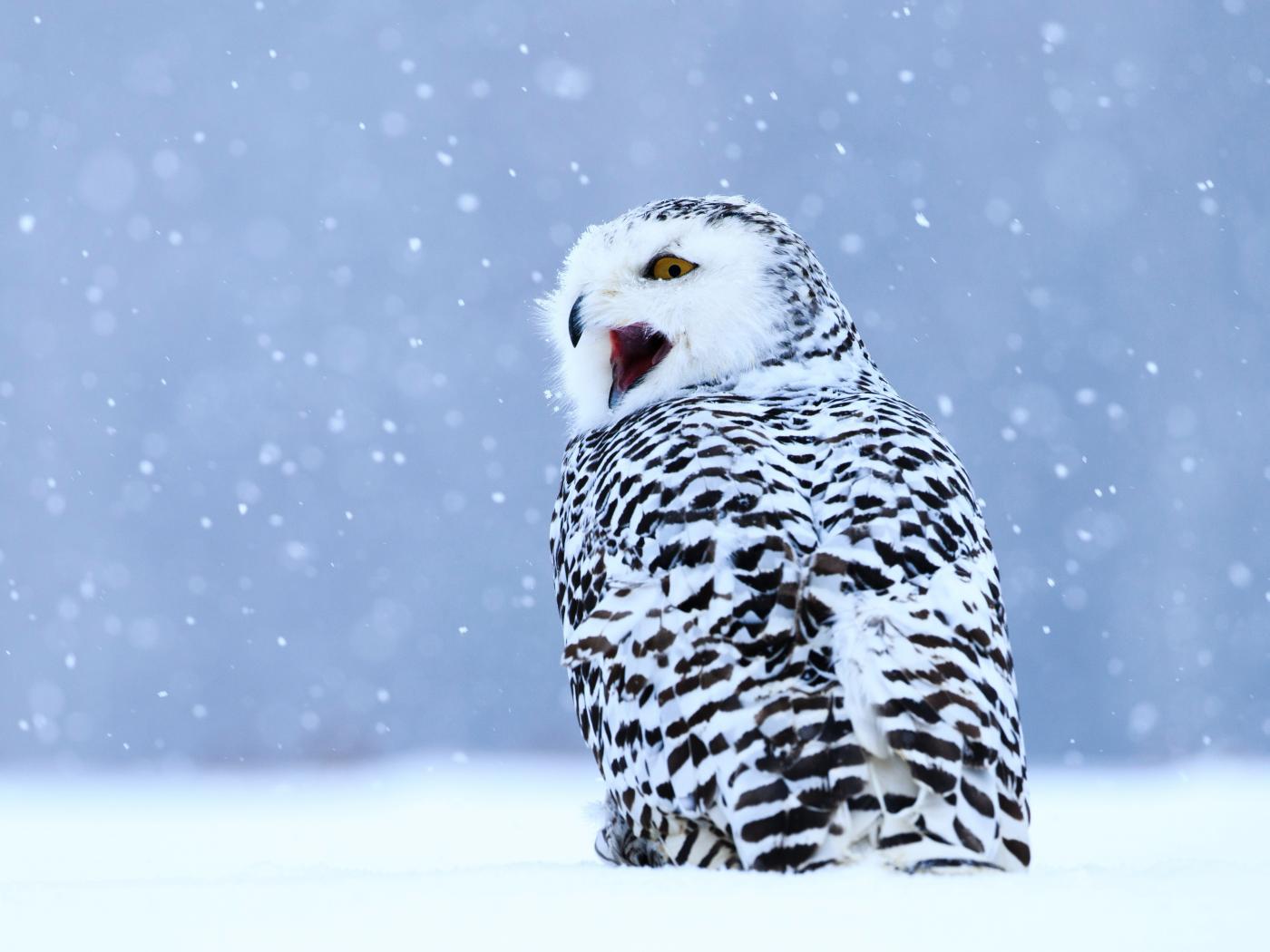 Обои Большая сова с открытым клювом сидит на снегу