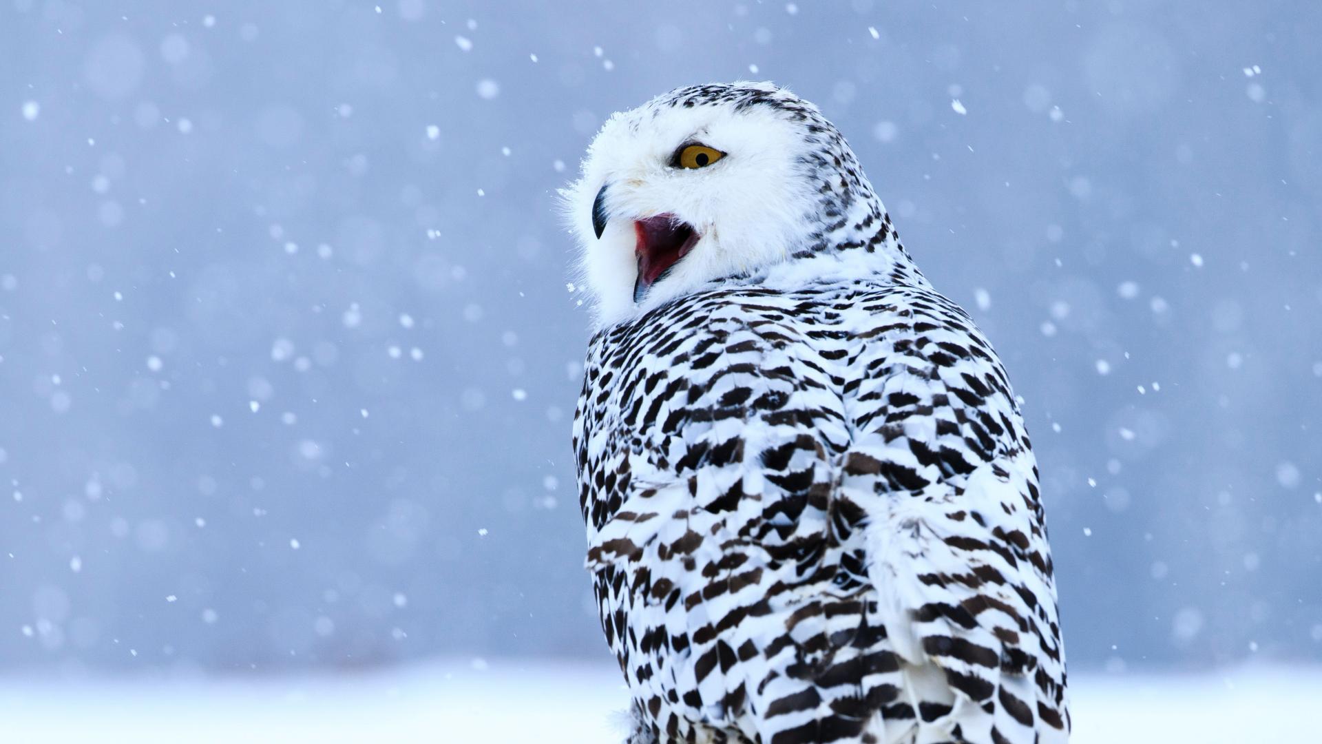 Обои Большая сова с открытым клювом сидит на снегу