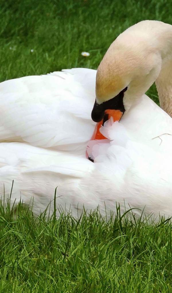 Обои Красивый белый лебедь лежит на зеленой траве