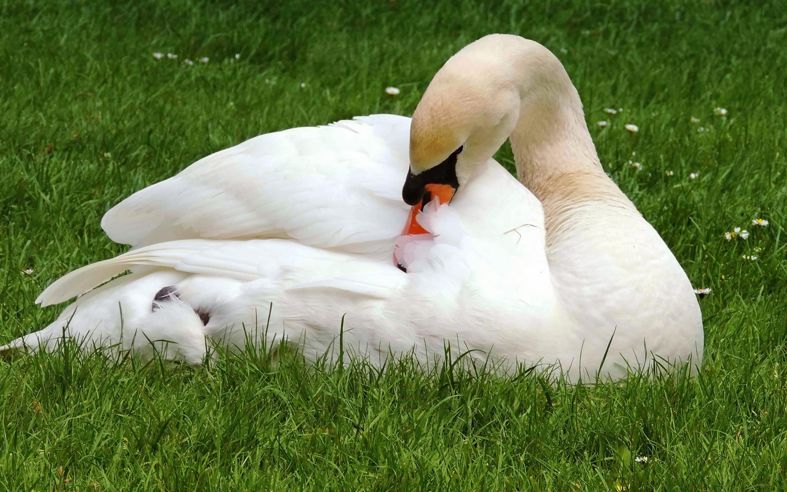 Обои Красивый белый лебедь лежит на зеленой траве