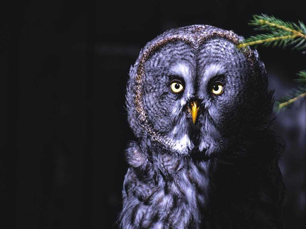 Обои Большая серая сова с желтыми глазами на ветке ночью