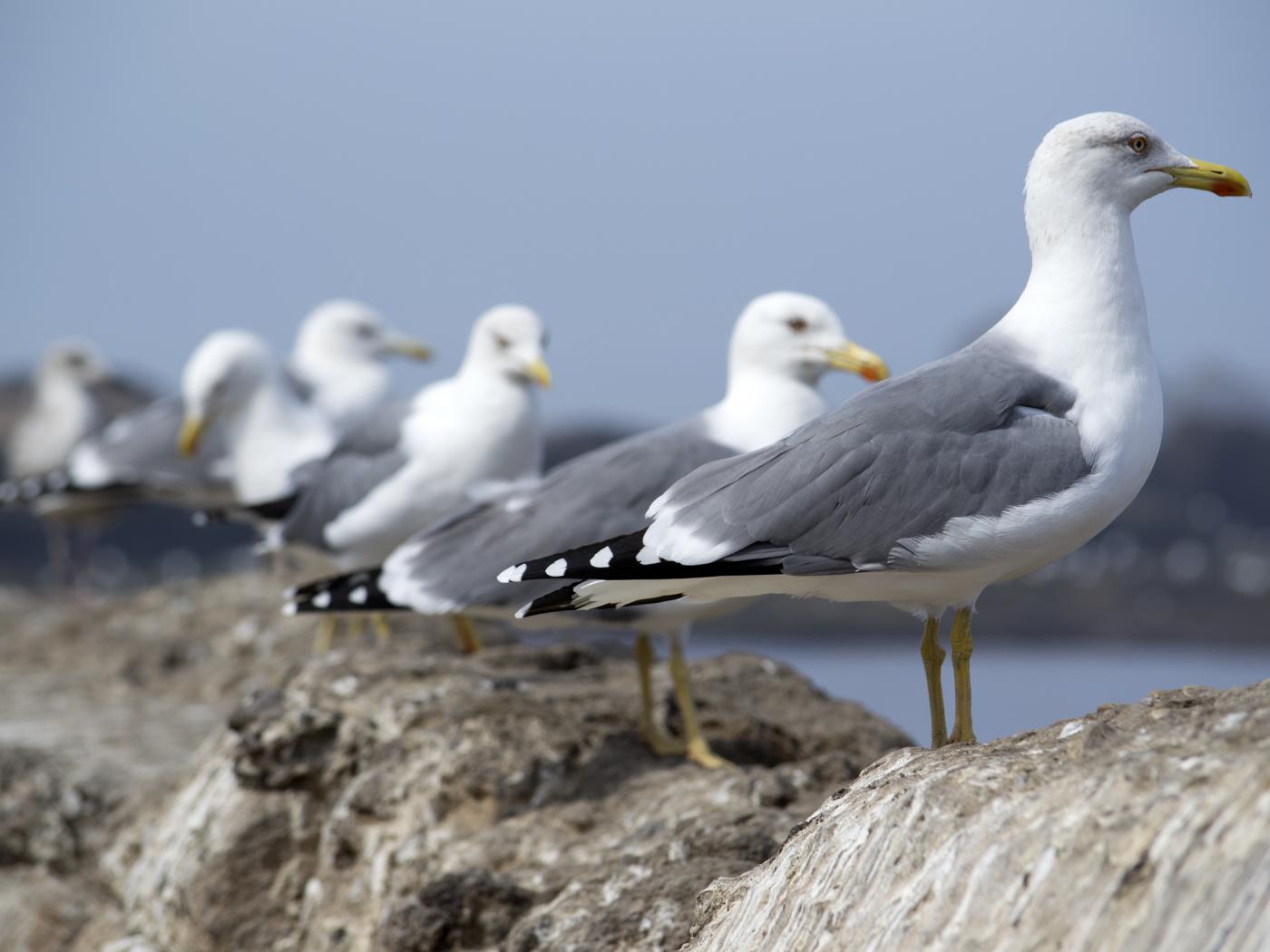 Обои Много морских чаек сидит на камнях