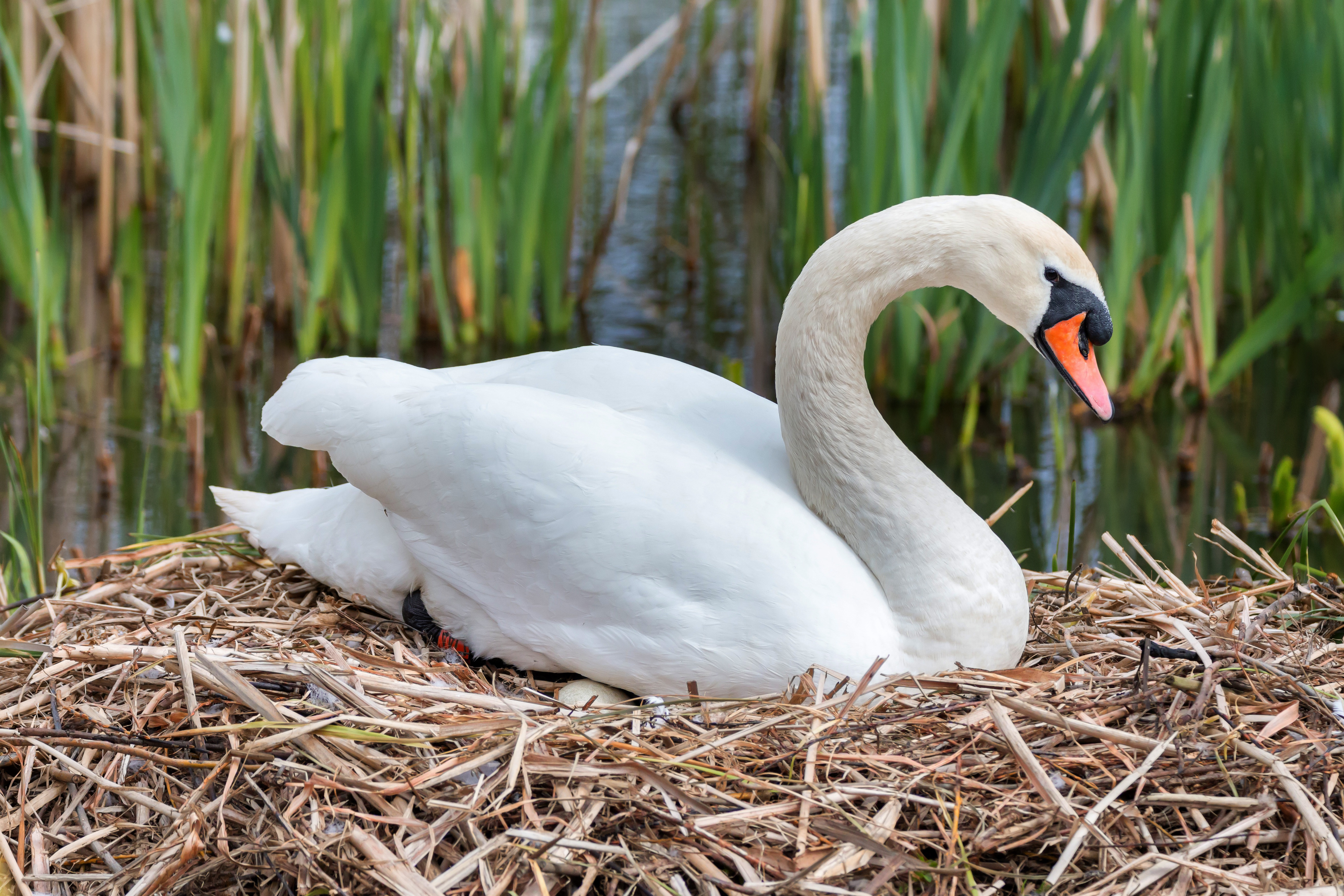 Обои Красивый белый лебедь сидит с яйцами на гнезде