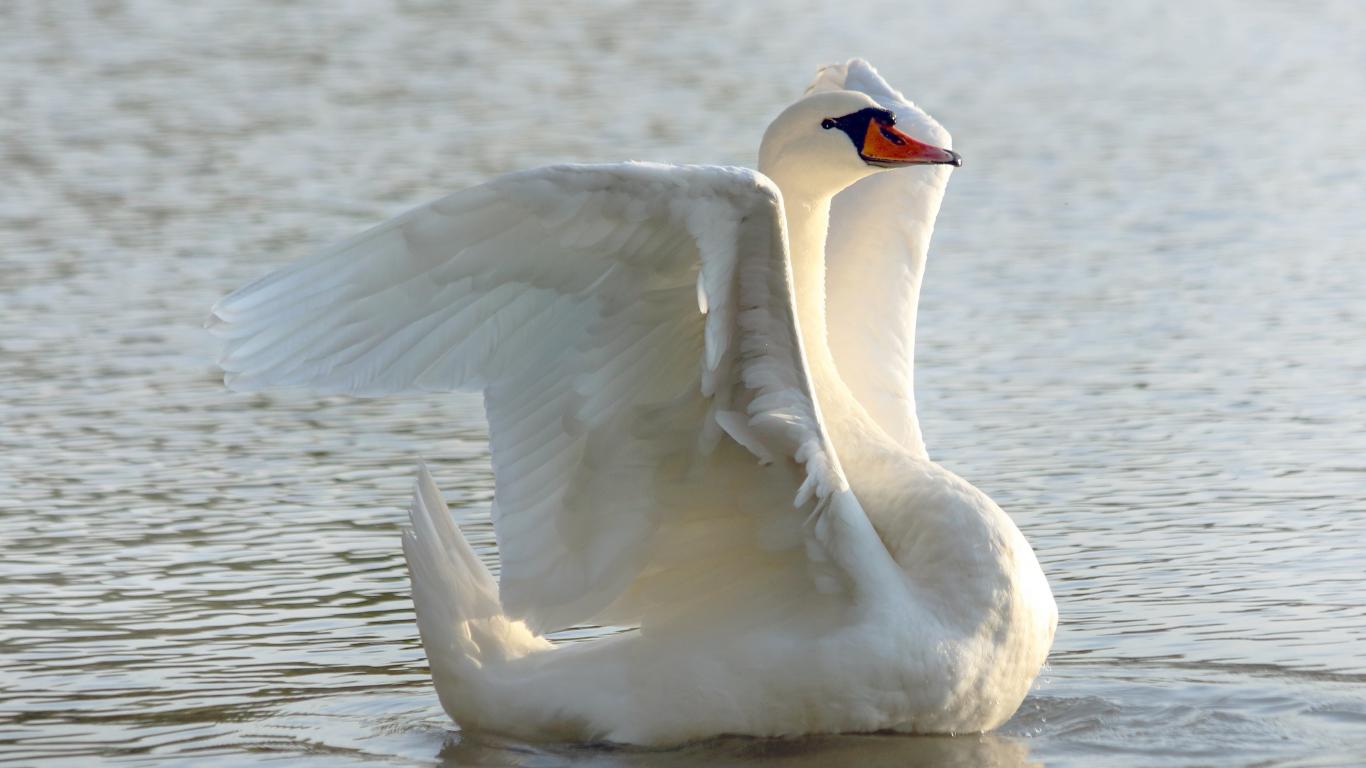Обои Большой белый лебедь расправил крылья в пруду