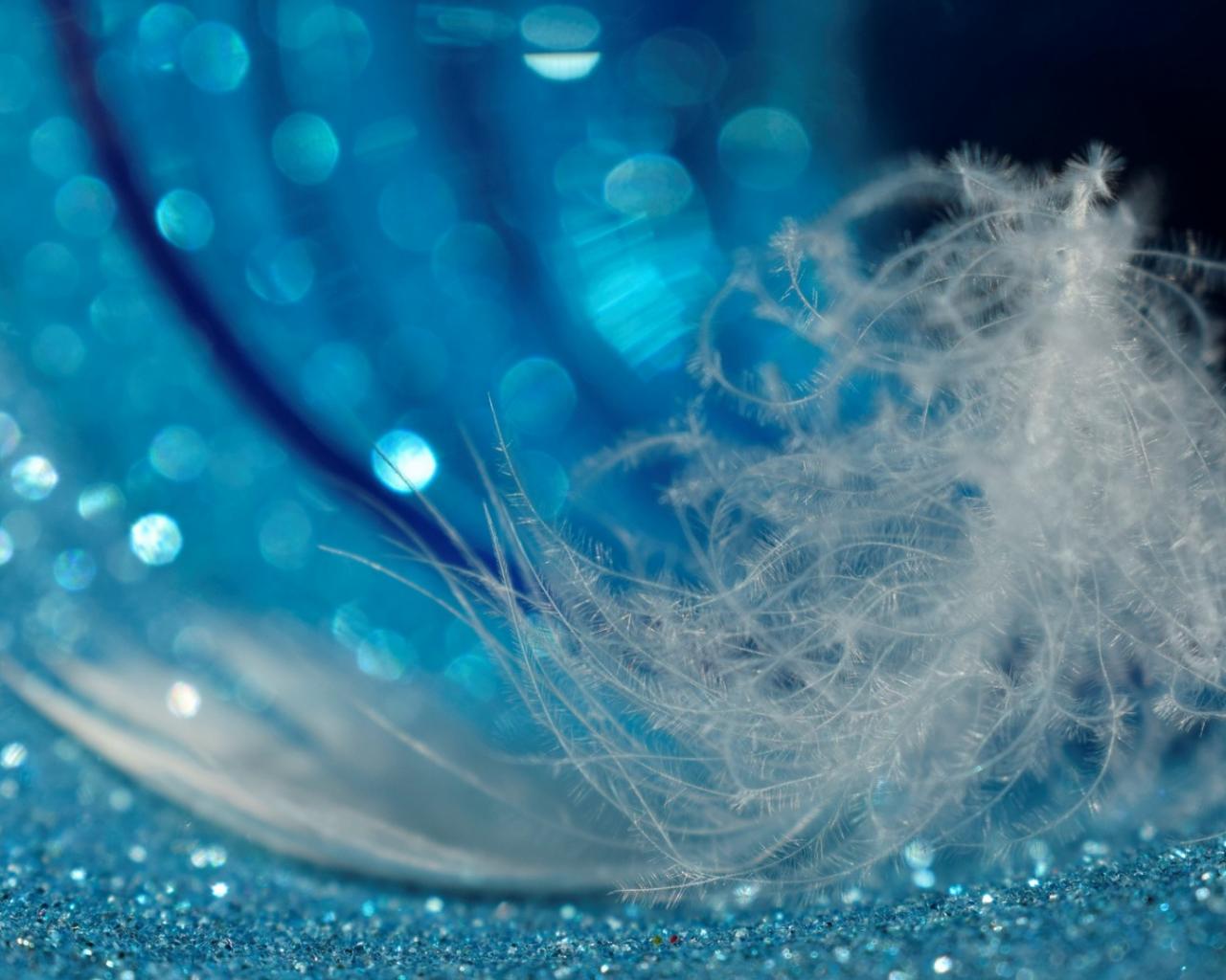 Обои Белое легкое перо лежит на блестящей голубой поверхности