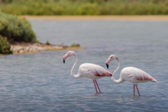 Обои Розовые фламинго отражаются в воде под красивым небом