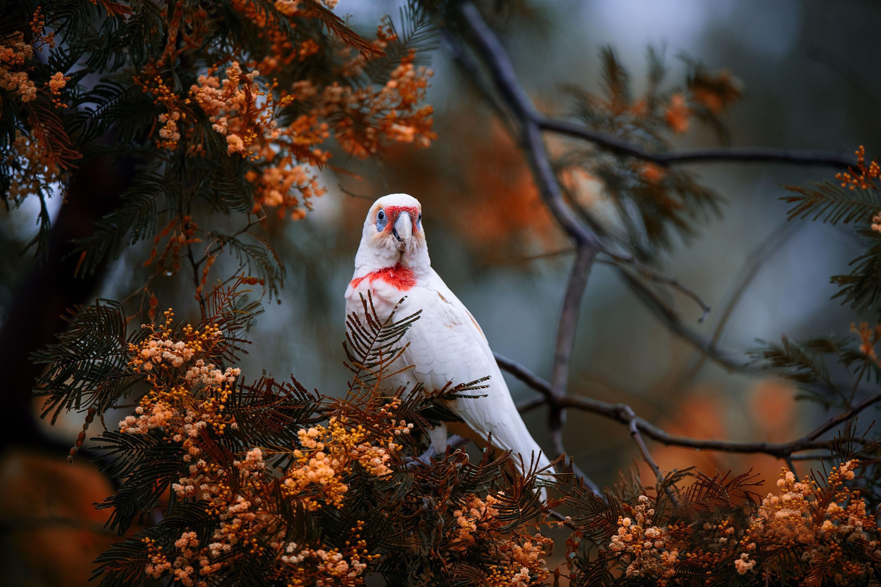 Обои Розовый попугай сидит на ветке дерева
