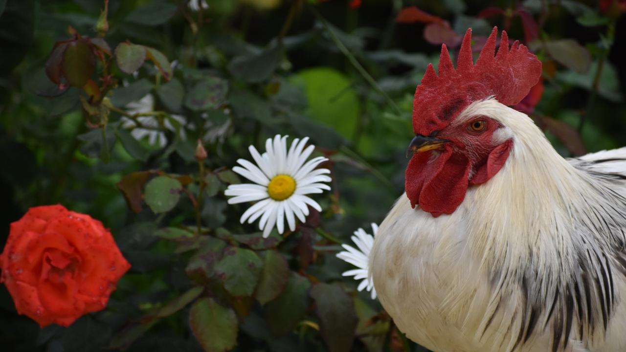 Обои Красивый большой домашний петух на фоне роз