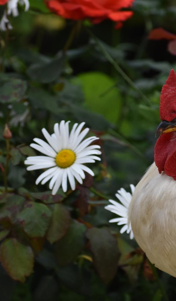 Обои Красивый большой домашний петух на фоне роз