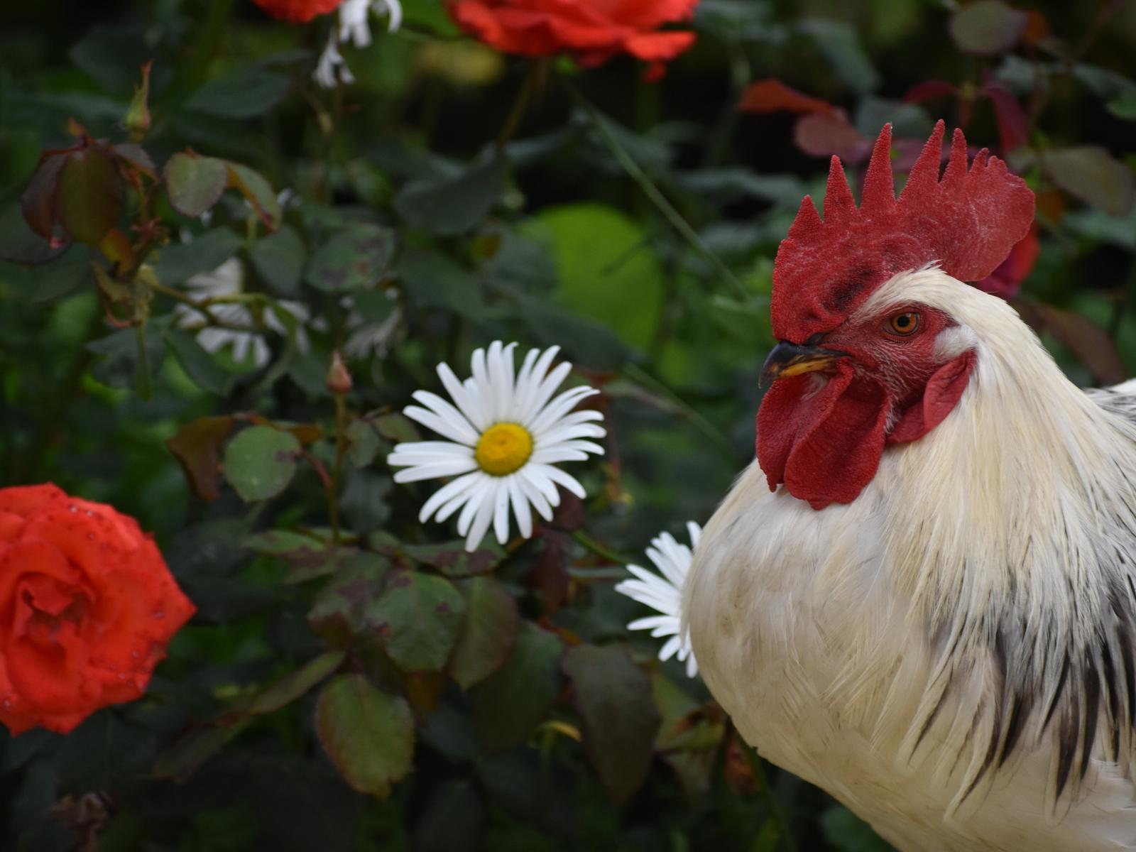 Обои Красивый большой домашний петух на фоне роз