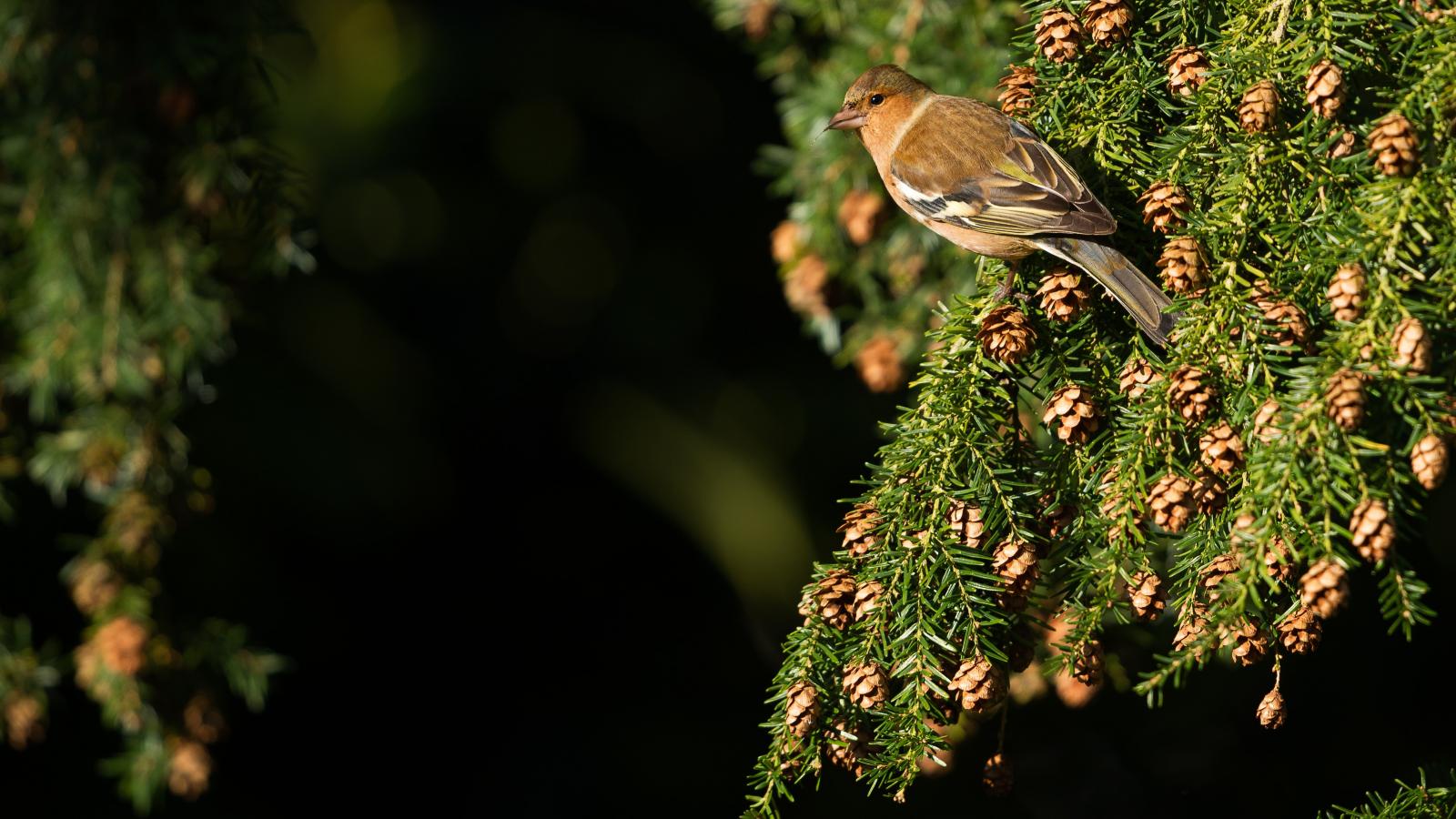 Обои Маленькая птичка сидит на зеленой ветке ели
