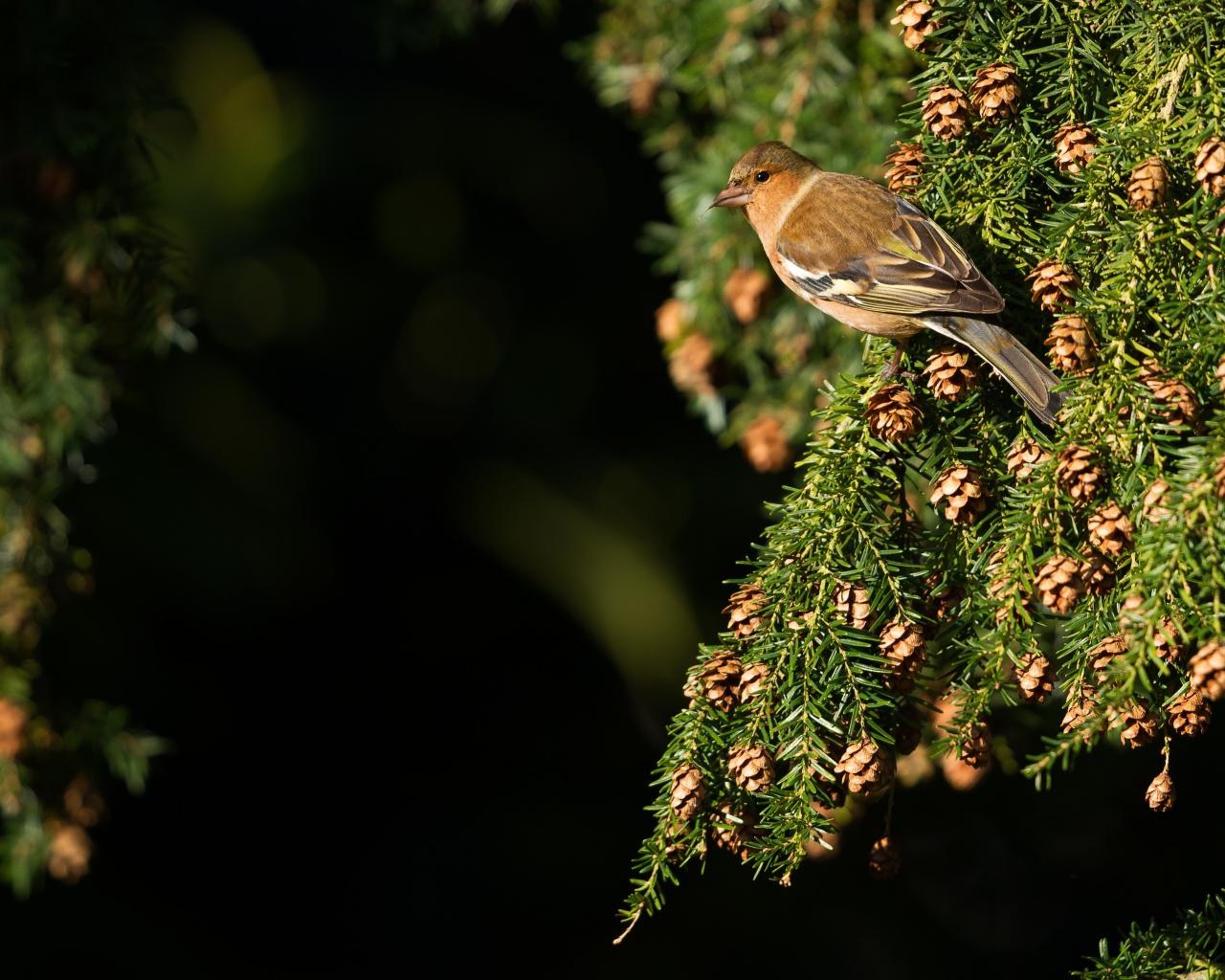 Обои Маленькая птичка сидит на зеленой ветке ели