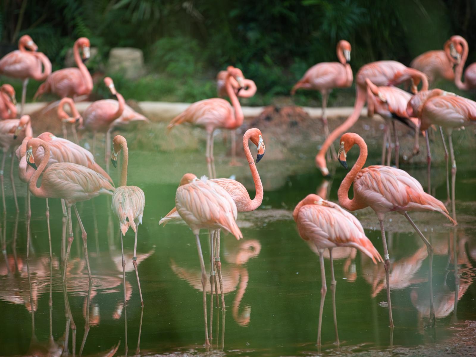 Обои Много розовых фламинго в воде в зоопарке