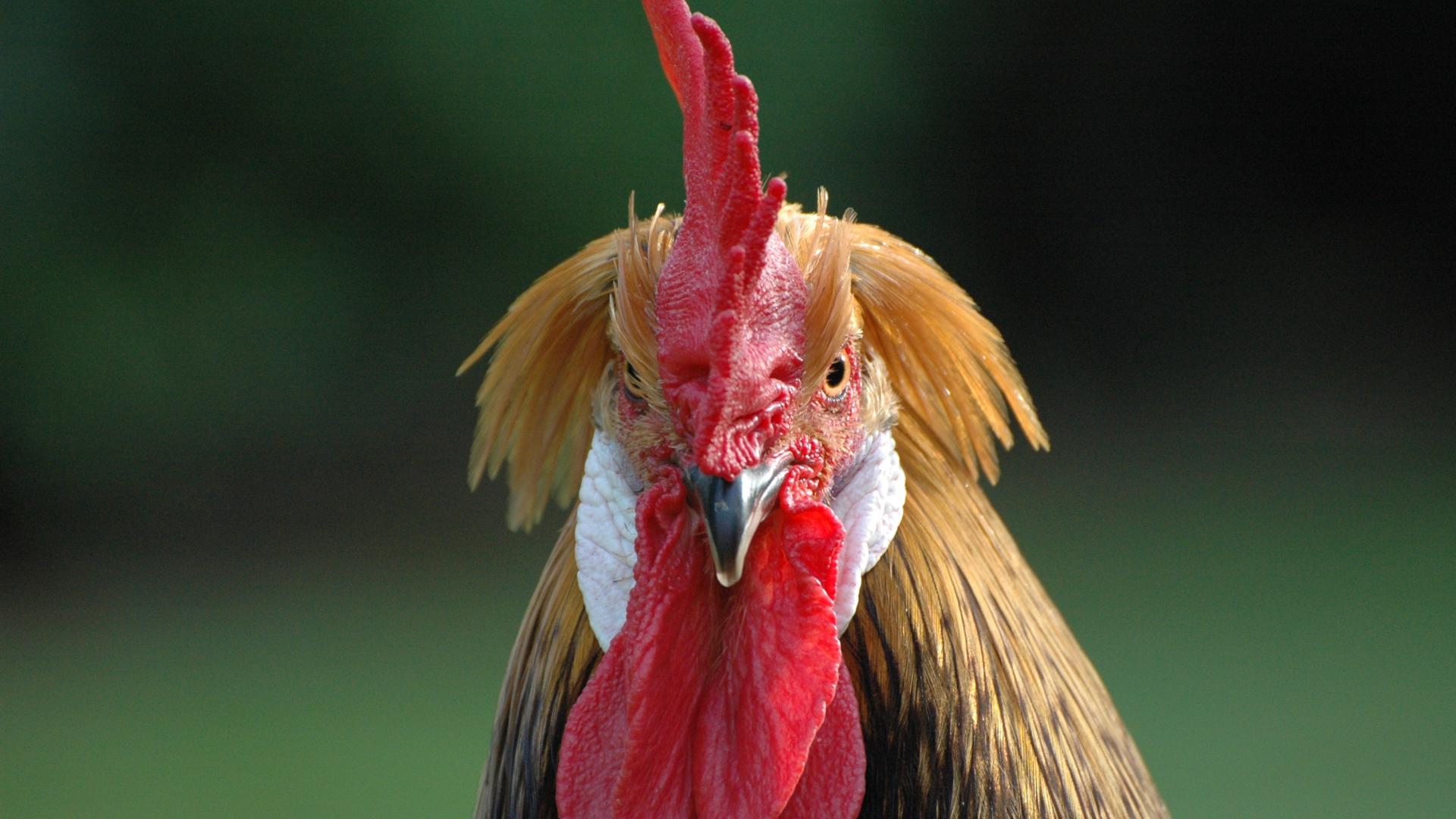 Обои Красивый домашний петух стоит на пне в лучах солнца