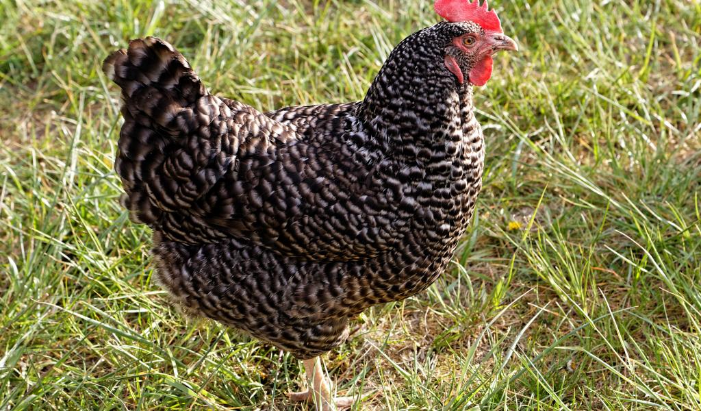 Обои Рябая домашняя курица на зеленой траве