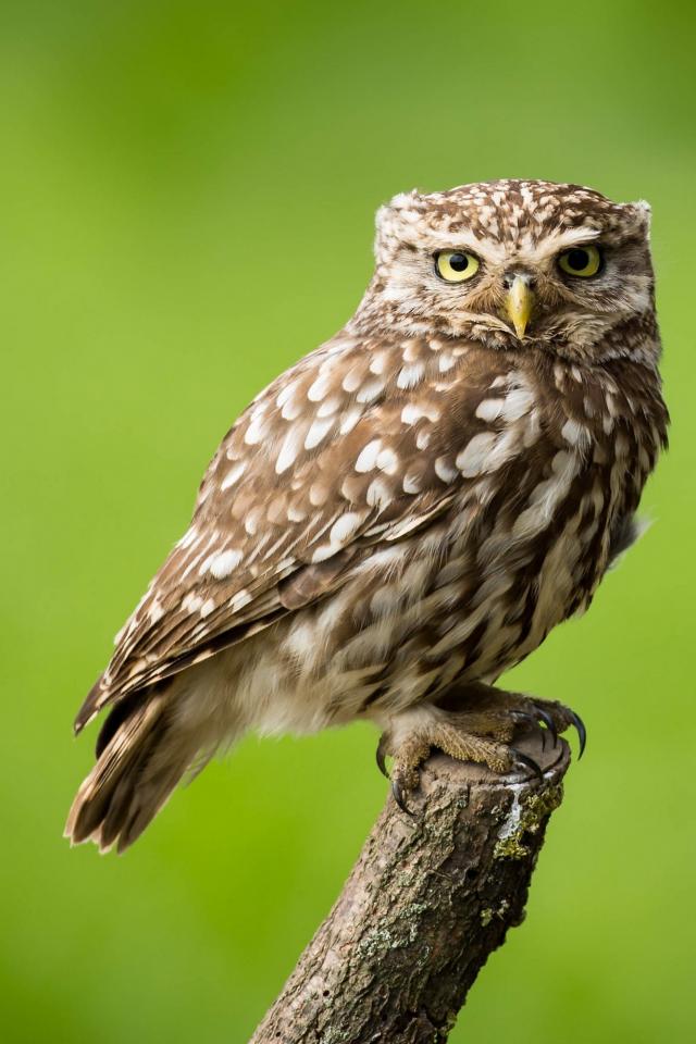 Обои Сова сидит на ветке на зеленом фоне