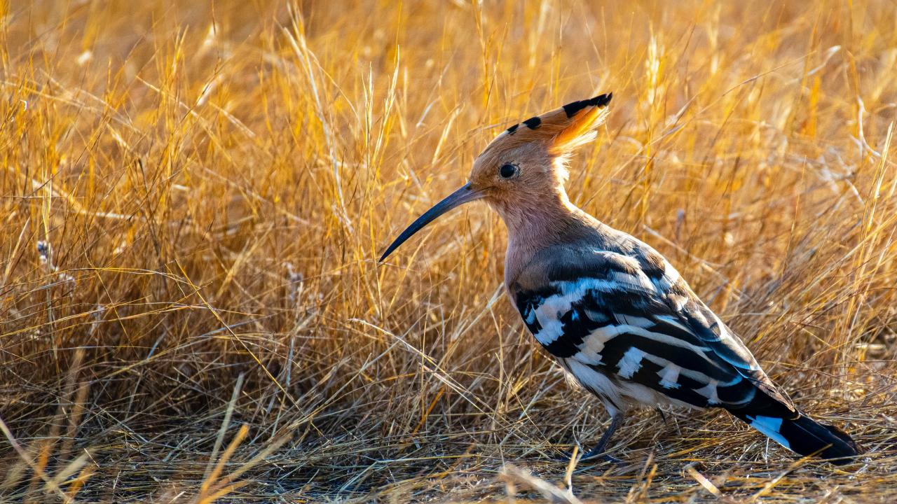 Обои Удод с острым клювом на сухой траве