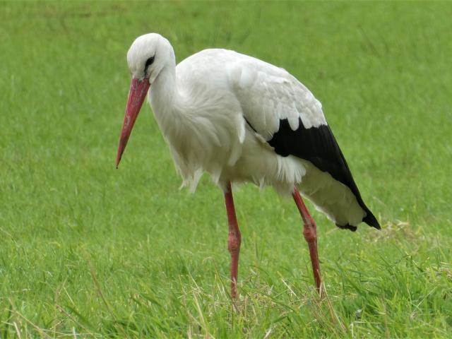 Обои Большой белый аист гуляет по зеленой траве