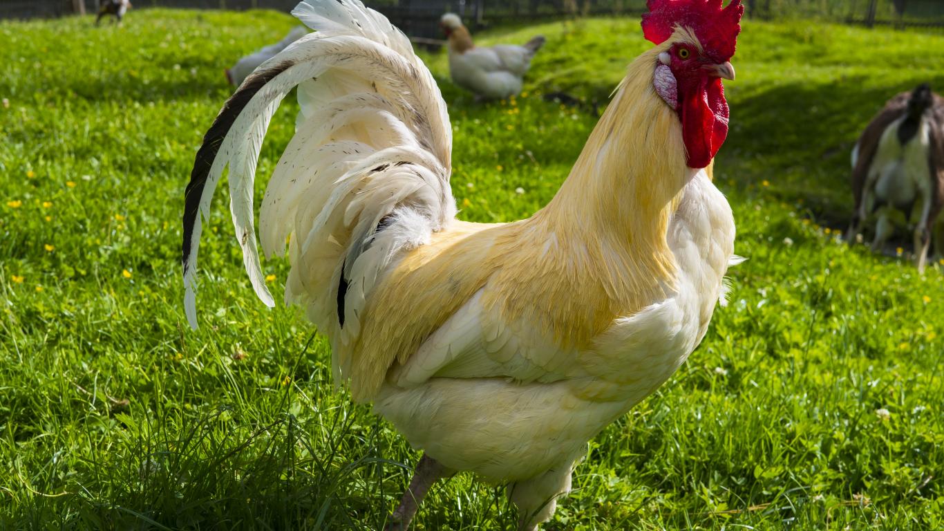 Обои Красивый белый домашний петух на зеленой траве