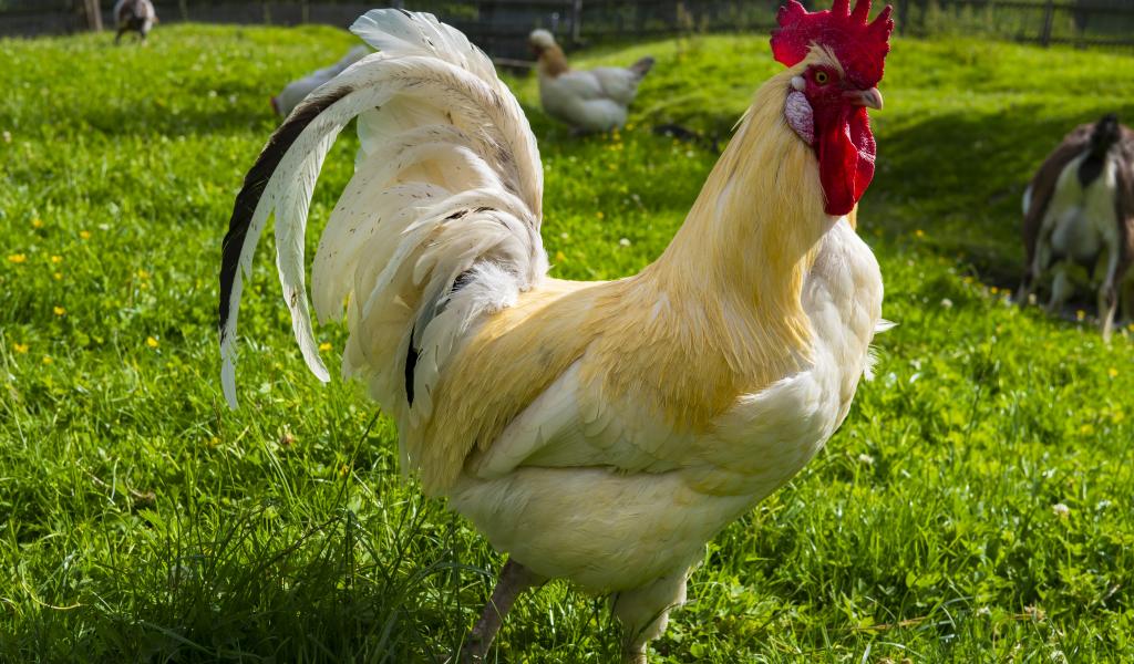 Обои Красивый белый домашний петух на зеленой траве