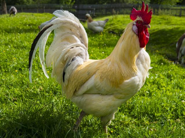 Обои Красивый белый домашний петух на зеленой траве