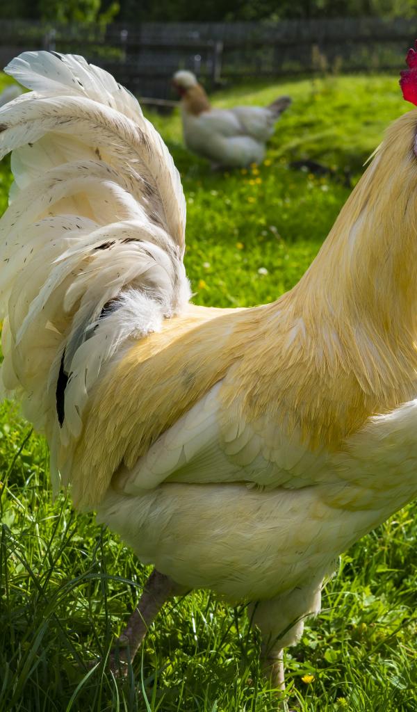 Обои Красивый белый домашний петух на зеленой траве