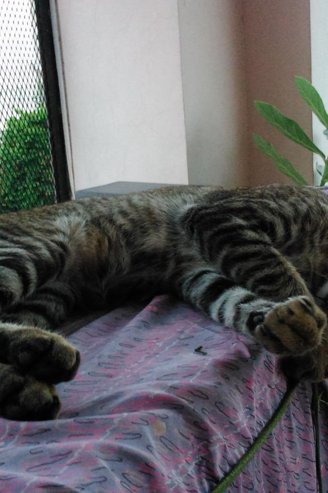 Обои Кот лежит у окна и играет с ниткой