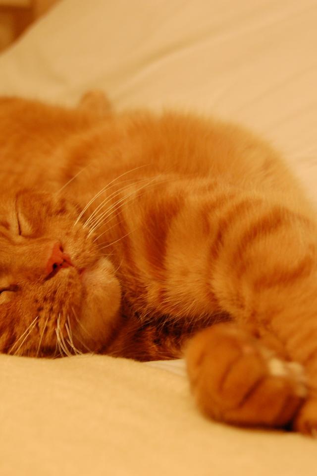 Обои Рыжий кот сладко спит на простыне