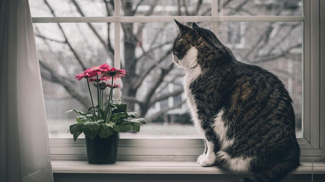 Обои Серый кот и цветок на подоконнике