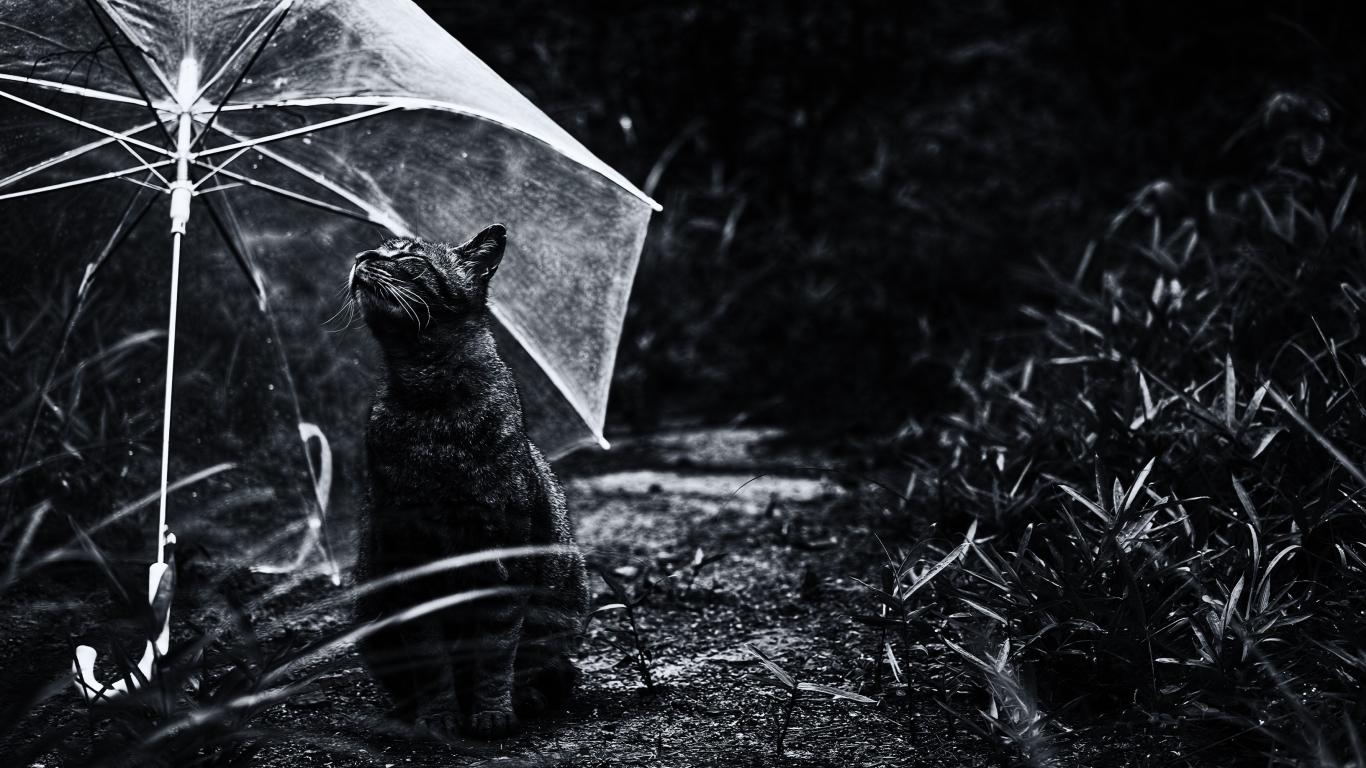 Обои Серый кот под прозрачным зонтом черно - белое фото
