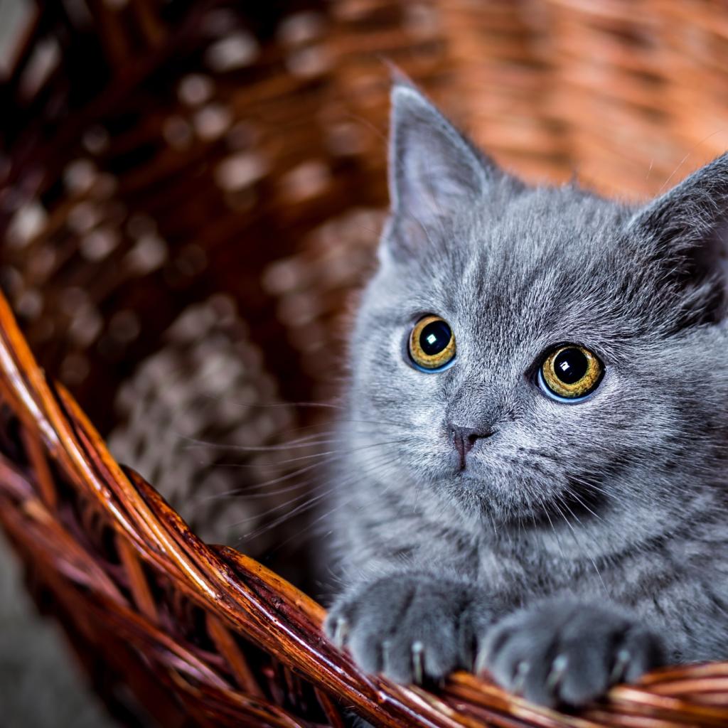 Обои Маленький котенок пепельного цвета в корзине