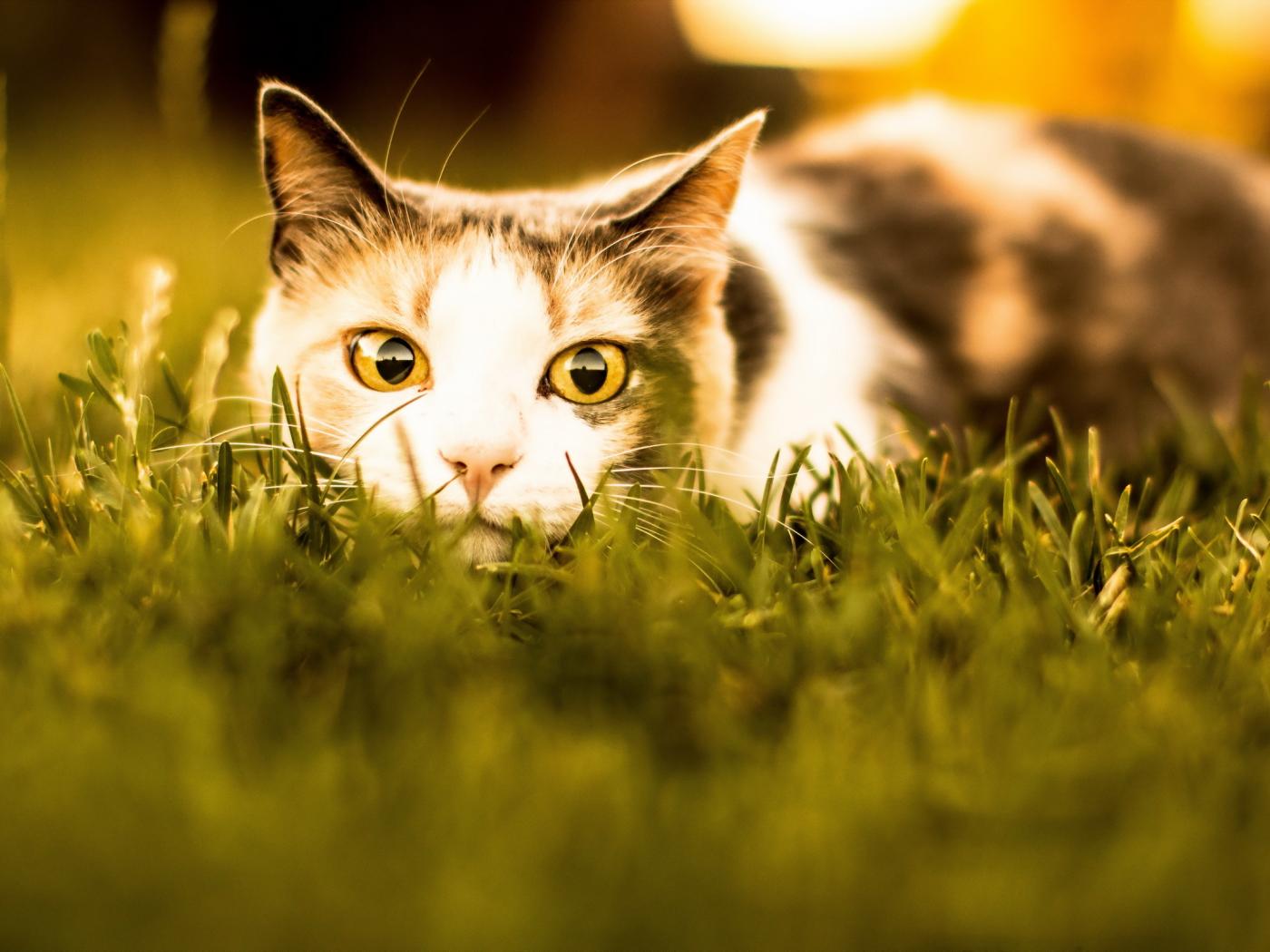 Обои Кошка с желтыми глазами притаилась в траве