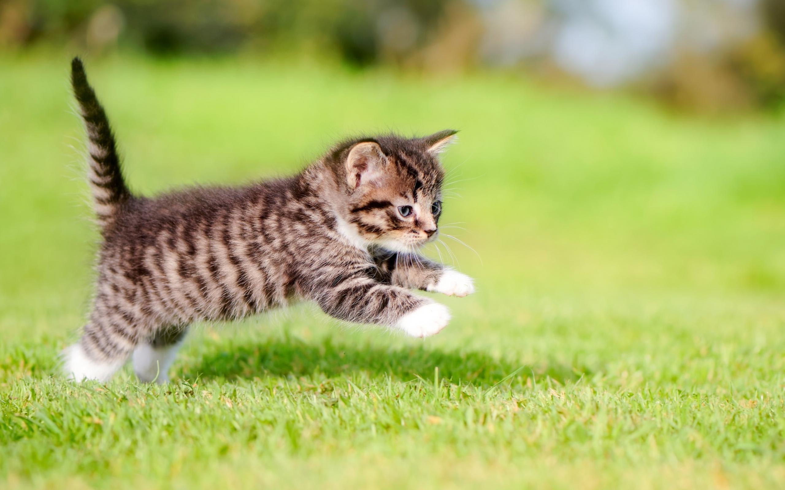 Обои Маленький серый котенок бежит по зеленой траве