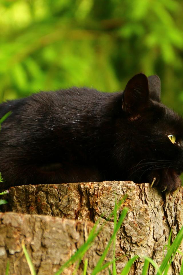 Обои Красивый черный кот лежит на пне