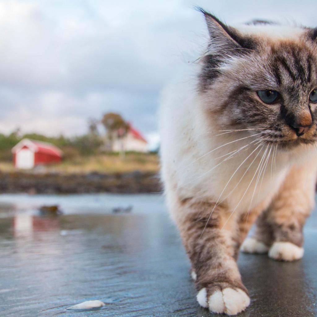 Обои Красивый голубоглазый кот идет по мокрой земле