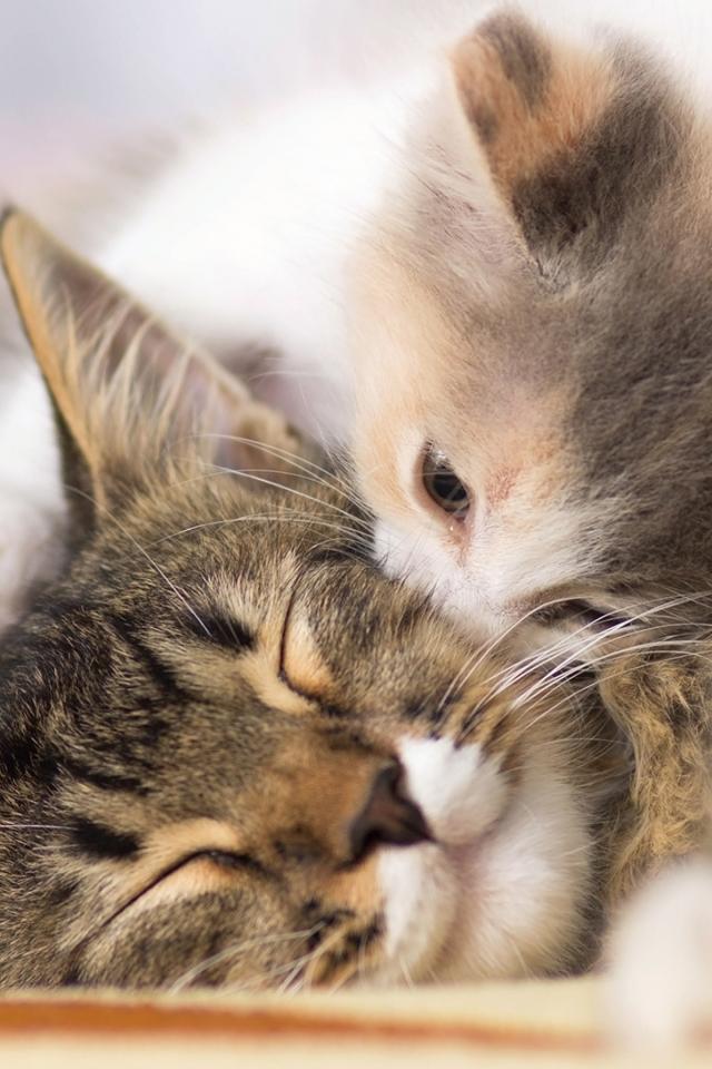 Обои Маленький милый котенок целует свою маму