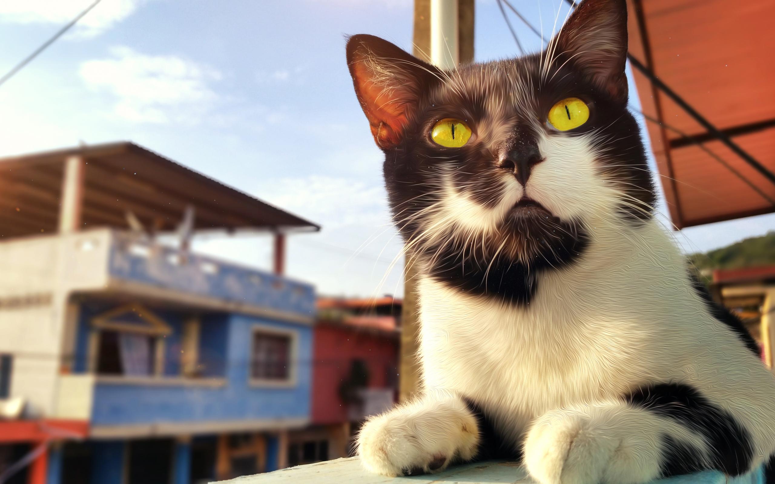 Обои Красивый черно-белый кот с большими желтыми глазами