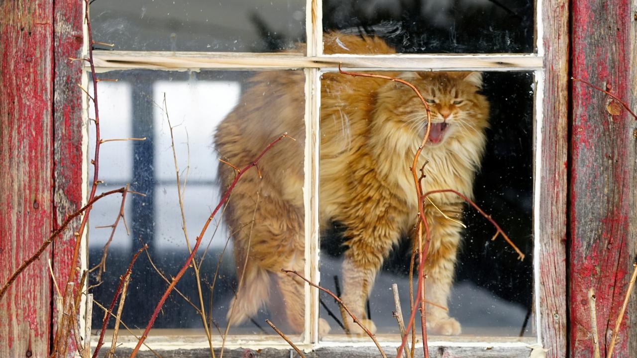 Обои Маленький рыжий котенок играет рождественским декором на окне