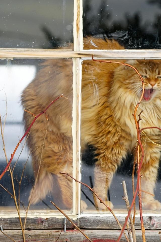 Обои Пушистый рыжий кот зевает в окне