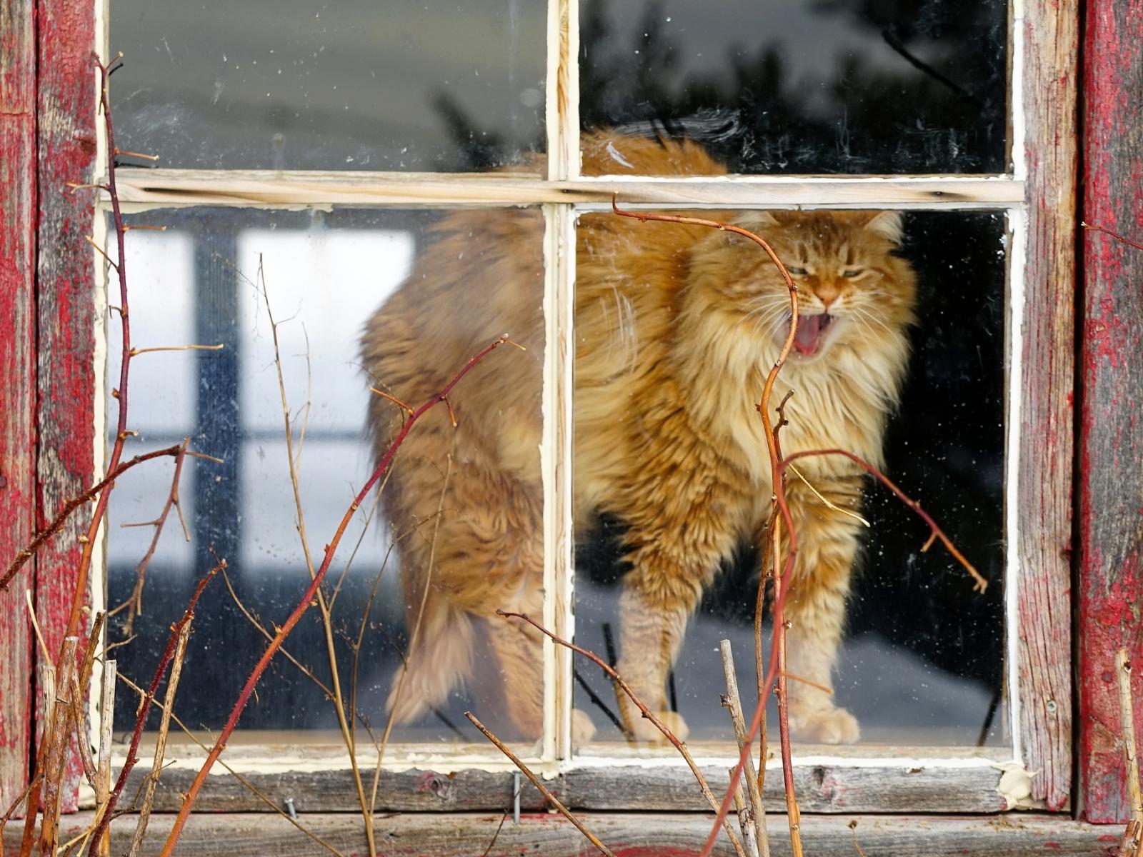 Обои Маленький рыжий котенок играет рождественским декором на окне