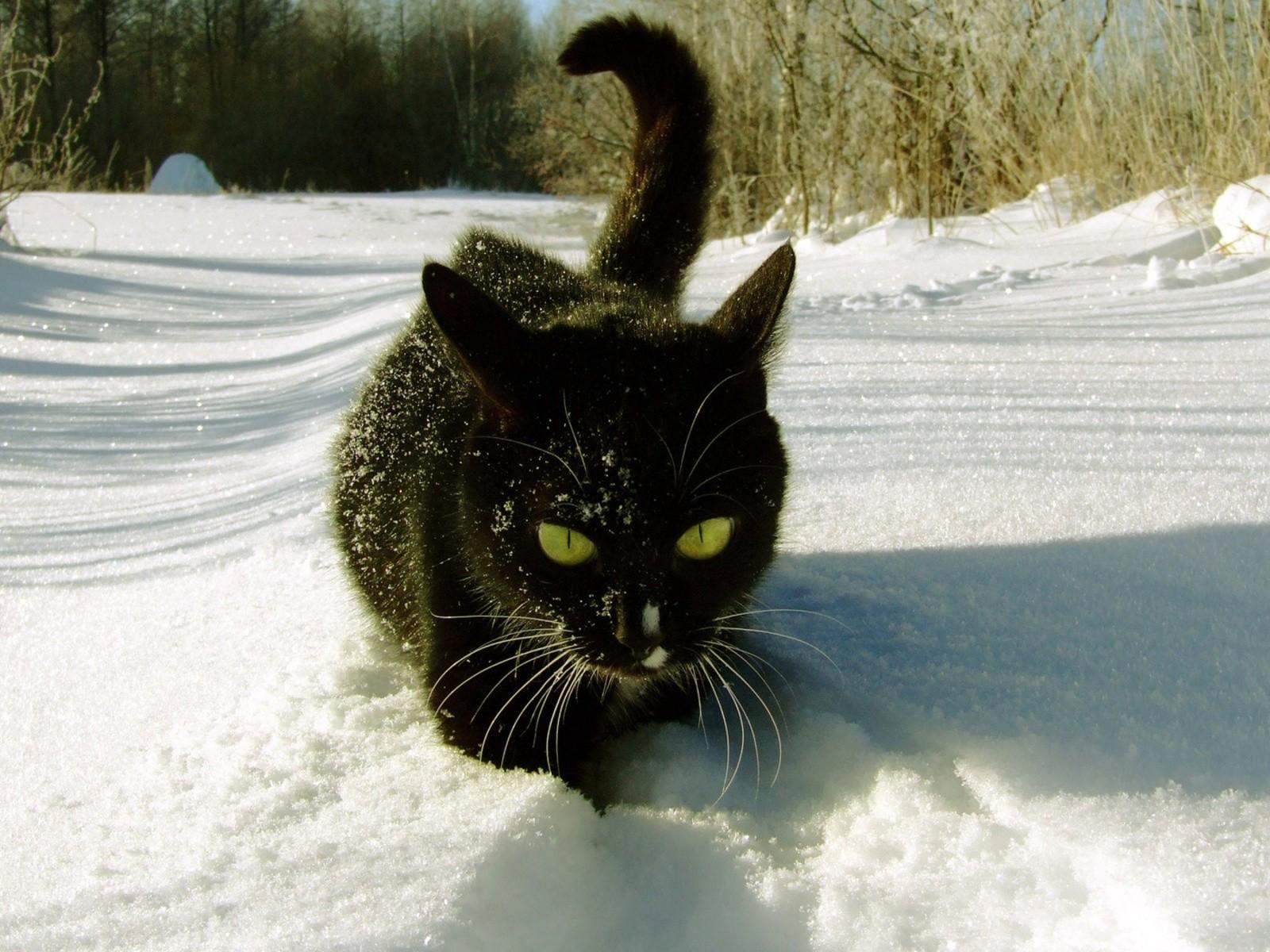 Обои Черный кот с желтыми глазами идет по белому снегу