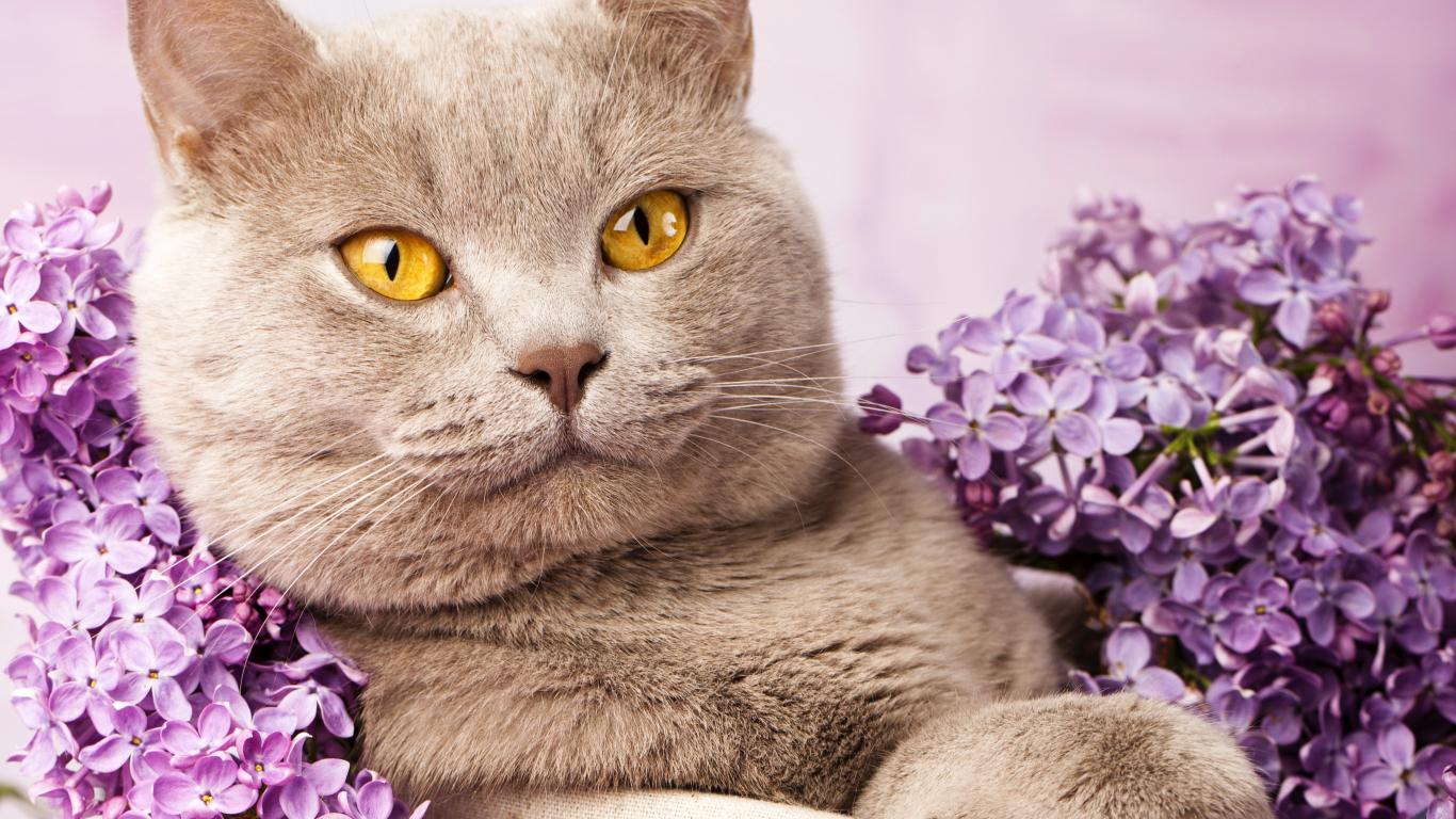 » Обои Красивый британский кот с цветами сирени