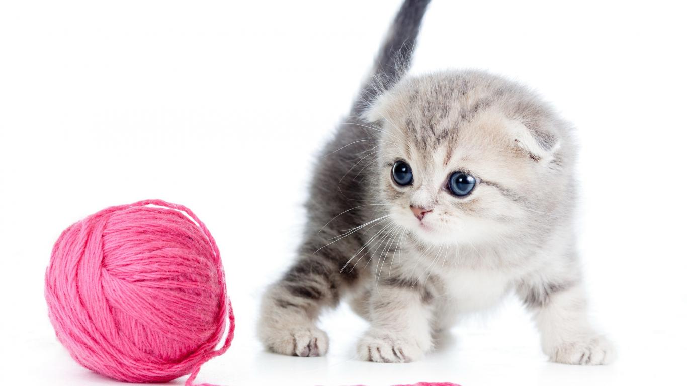 Обои Маленький серый котенок с розовым клубком ниток