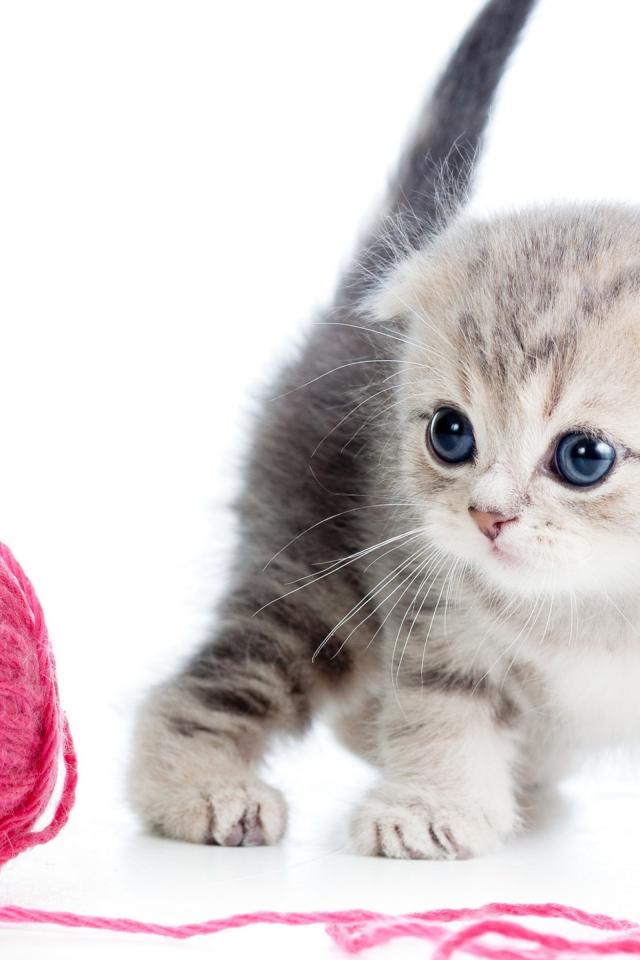 Обои Маленький серый котенок с розовым клубком ниток