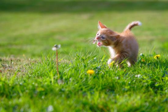 Обои Маленький рыжий котенок играет с цветком одуванчика